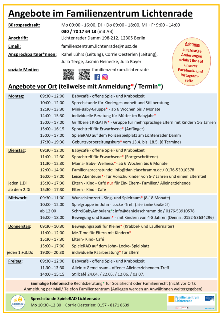 Für zeitnahe Terminänderungen und Informationen zu unseren Angeboten finden Sie uns auch auf www.facebook.com/familienzentrum.lichtenrade