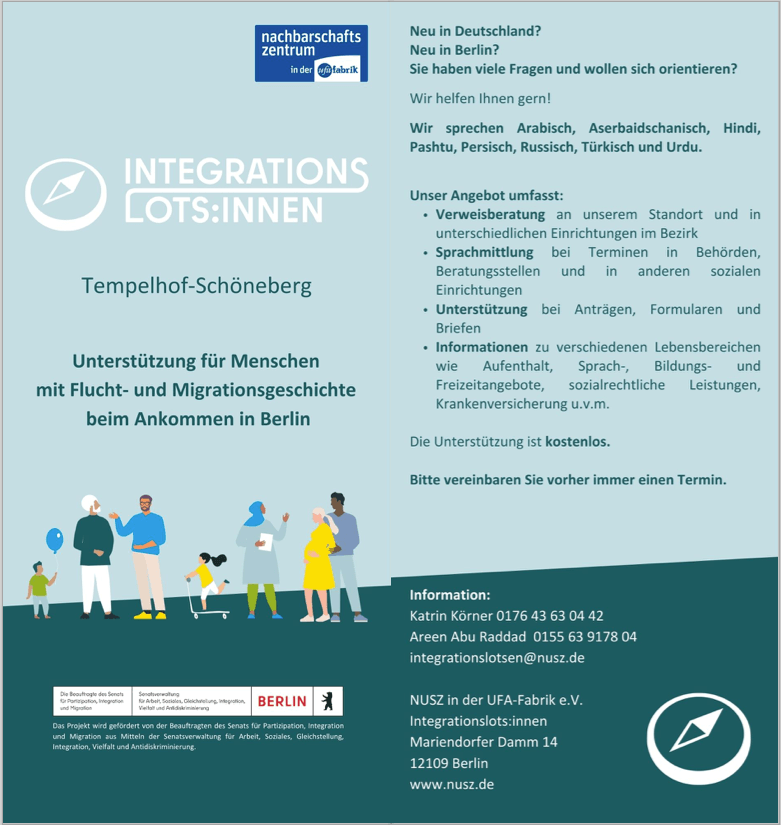 Integrationslots:innen sind muttersprachliche Sprach- und Kulturmittler:innen. Die Integrationslots:innen unterstützen Neuzugewanderte und schon länger vorrangig in Tempelhof-Schöneberg lebende Menschen mit Migrations- und Fluchtgeschichte dabei ihre Lebenssituation nachhaltig zu verbessern, indem sie diese mit den vielfältigen Hilfs- und Unterstützungsangeboten in Berlin bekannt machen.