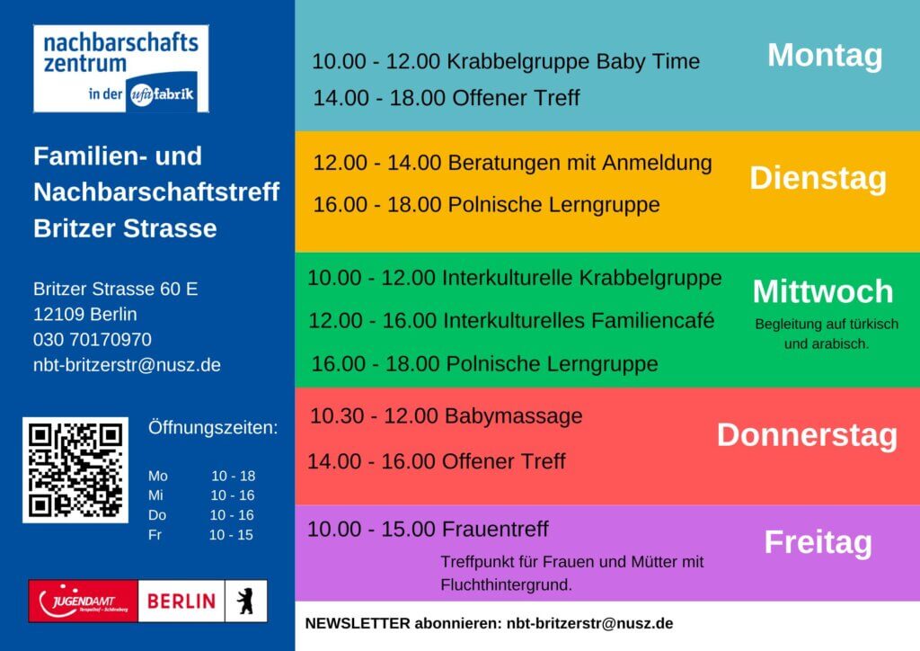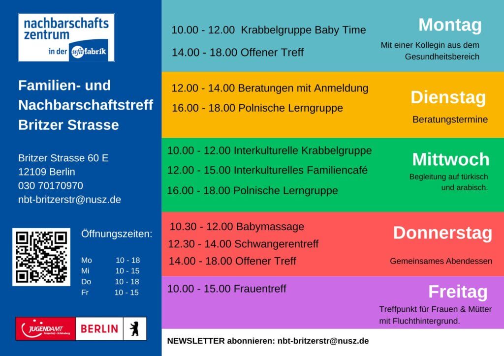 Aktuelle Termine und Beratungsangebote können telefonisch oder per Mail erfragt werden. Für zeitnahe Terminänderungen und Informationen zu unseren Angeboten finden Sie uns auch unter: https://www.instagram.com/nbt.britzer